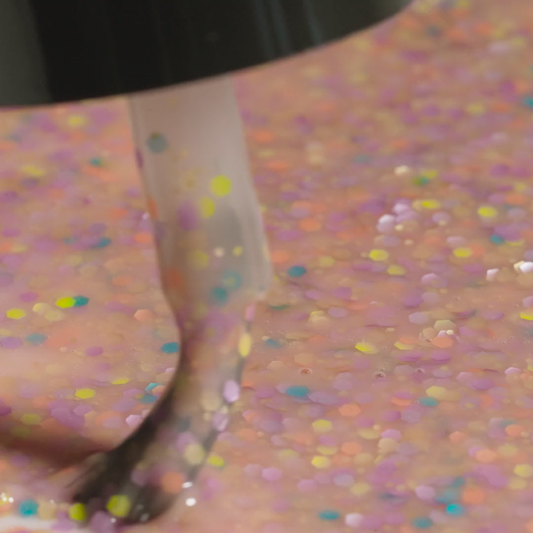 Sunny Dots is more than just beige – it’s beige with a surprise. A semi-transparent base with a sun-kissed glow, enriched with multicoloured particles that create a light, artistic chaos on your nails. When you wear it, you’re saying: “I like calm, but with a twist.” It looks stunning on its own, but also works beautifully as a topper, giving you endless ways to express yourself. Perfect for fans of subtle glow who aren’t afraid to experiment.