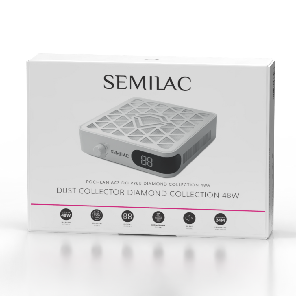 The Semilac Dust Collector Diamond Collection 48W is a must-have device for every nail technician—ideal for both professional salons and home use. With its 48W power and 3500 RPM motor, it effectively captures dust produced during nail plate filing, keeping your workspace clean and safe.